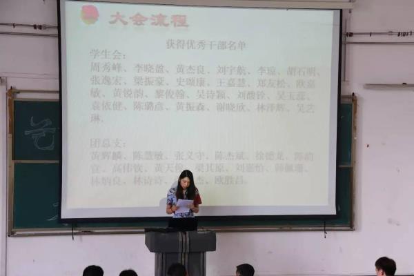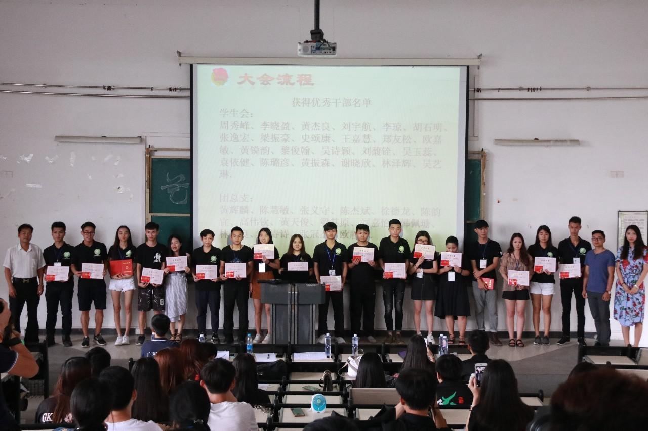 大会在所有人热烈的掌声中开始。首先,15级学生会主席周秀峰对本学年的学生会工作做了简要的回顾与总结,并对16级新一届的团学干部寄予了希望。 随后,团总支书记于玥老师宣布了15级获得优秀团学干部的名单并由黄觉书记、于玥老师、王超老师为获奖干部颁发了荣誉证书。