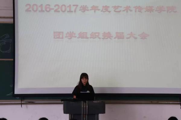 2017年6月14日下午2点40分,在阶梯二教室召开了艺术传媒学院团学新一轮的换届大会。参加本次会议的有艺术传媒学院黄觉结党总支部副书记、团总支书记于玥老师、王超辅导员、15级团学各部门部长、干事以及16级新一届各部门部长。会议由学生会新一届秘书部部长杜双双主持。
