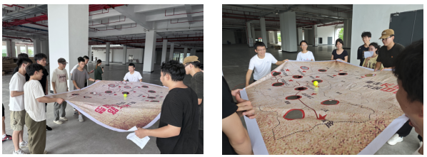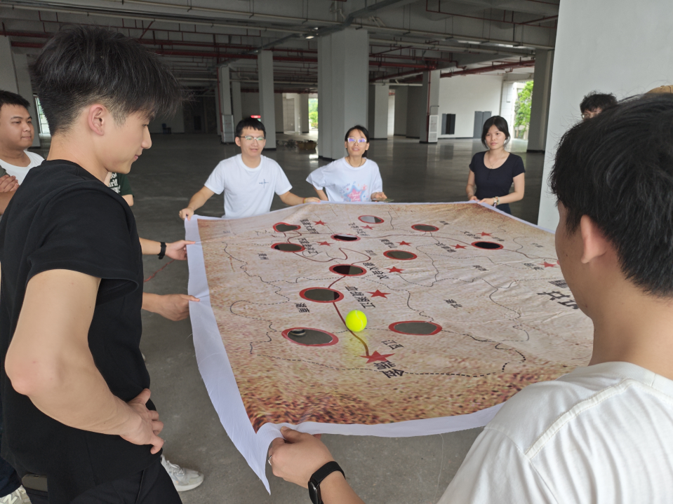 2、重走长征路:通过长征线路图和网球接力,团队协作将“中央红军”从瑞金送达延安,感受长征的艰难险阻。