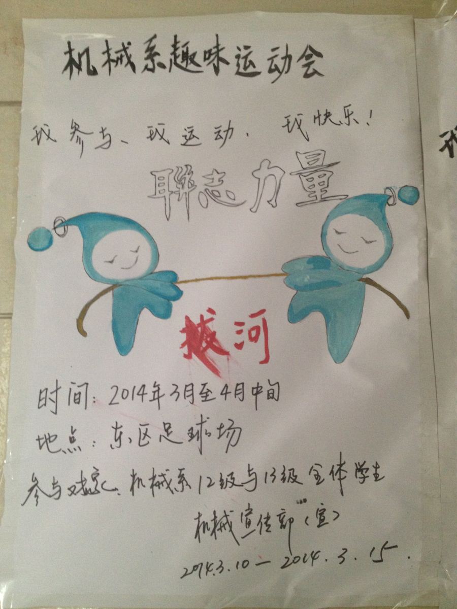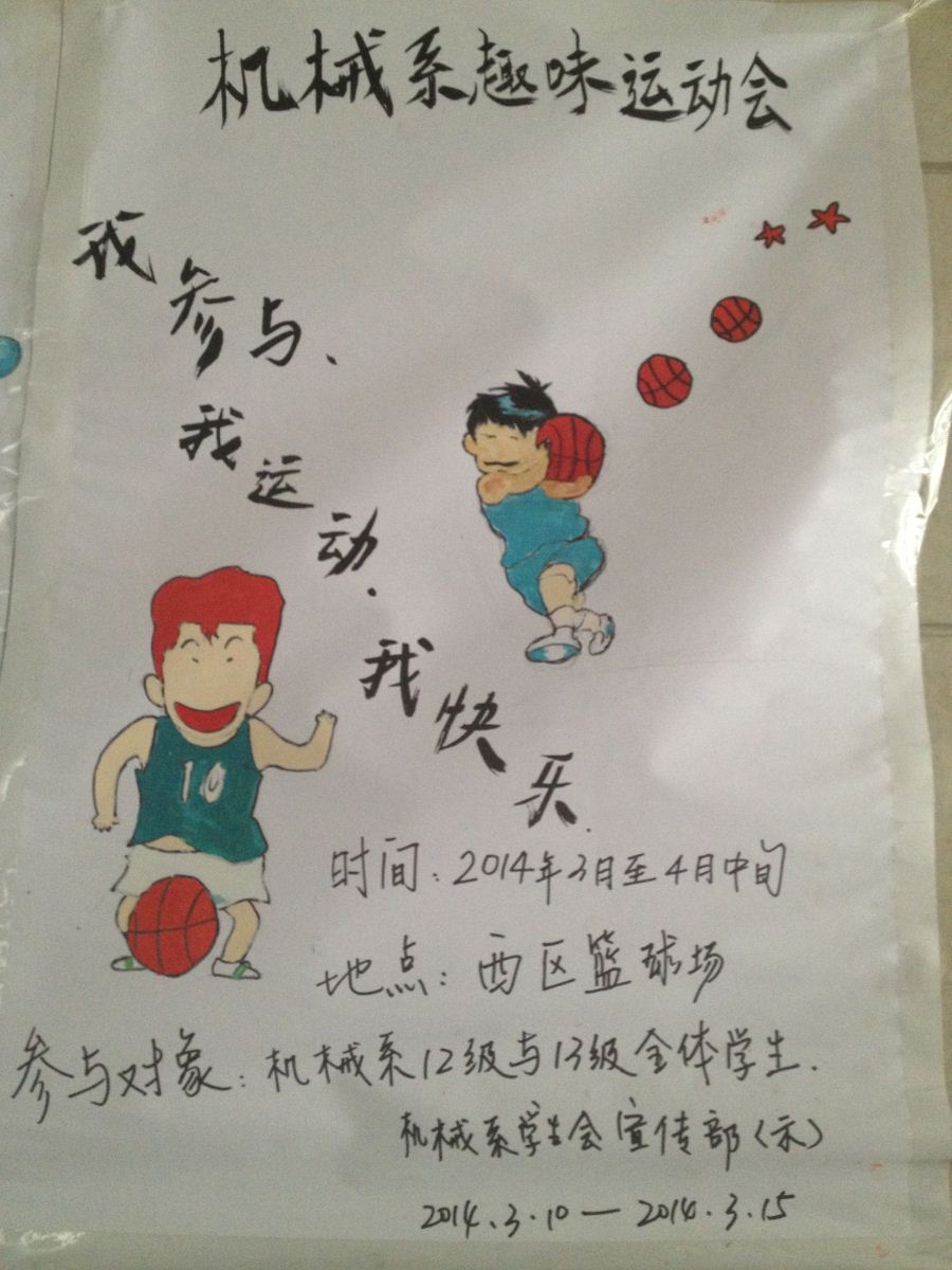 为提高我系的体育活动气氛,增强我系学子的身体素质,锻炼同学们更强的意志,培养同学们对加强自身体育锻炼的兴趣。我系学生会于3月中旬至4月中旬开展以“我参与,我运动,我快乐”为主题的体育文化节。本次体育文化节是继去年之后我系第二次召开此类活动。