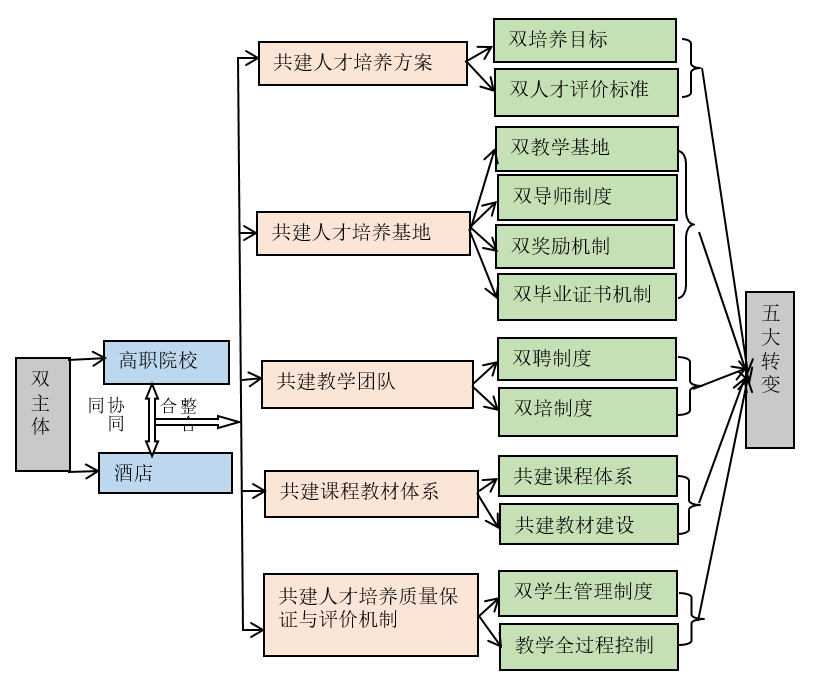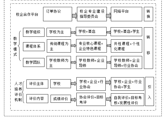 (1)提出并推动专业人才培养工作发生“五大转变”,实现高职院校教育资源和企业培训资源的优化整合。一是酒店身份的转变,酒店由单纯的用人企业, 转变为人才培养的主体;二是教师身份的转变,教师从简单的教书匠,转变为“教师+酒店管理者”、“教师+酒店培训师”;三是酒店高管身份的转变,酒店高管由单纯的管理者转变为“管理者+教师”;四是学生身份的转变,学生从单纯的高职院校学生转变为“学生+酒店准员工”;五是学校身份的转变,学校由单纯的教学单位转变为“学校+酒店培训机构”。
