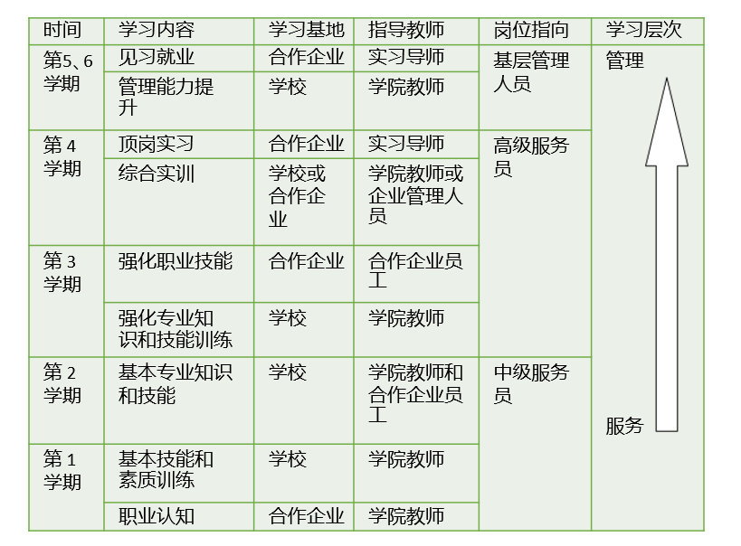 根据高职院校教学安排规律和人才成长理论,经过与多家酒店企业的交流、探讨,按照每一届学生全学程 6 个学期的时间跨度,制度以下双主体酒店中高端服务(管理)人才培养模式的实施步骤: